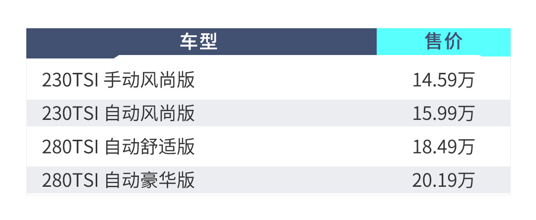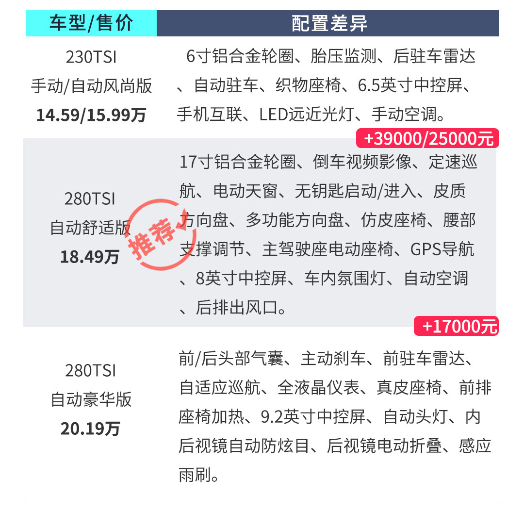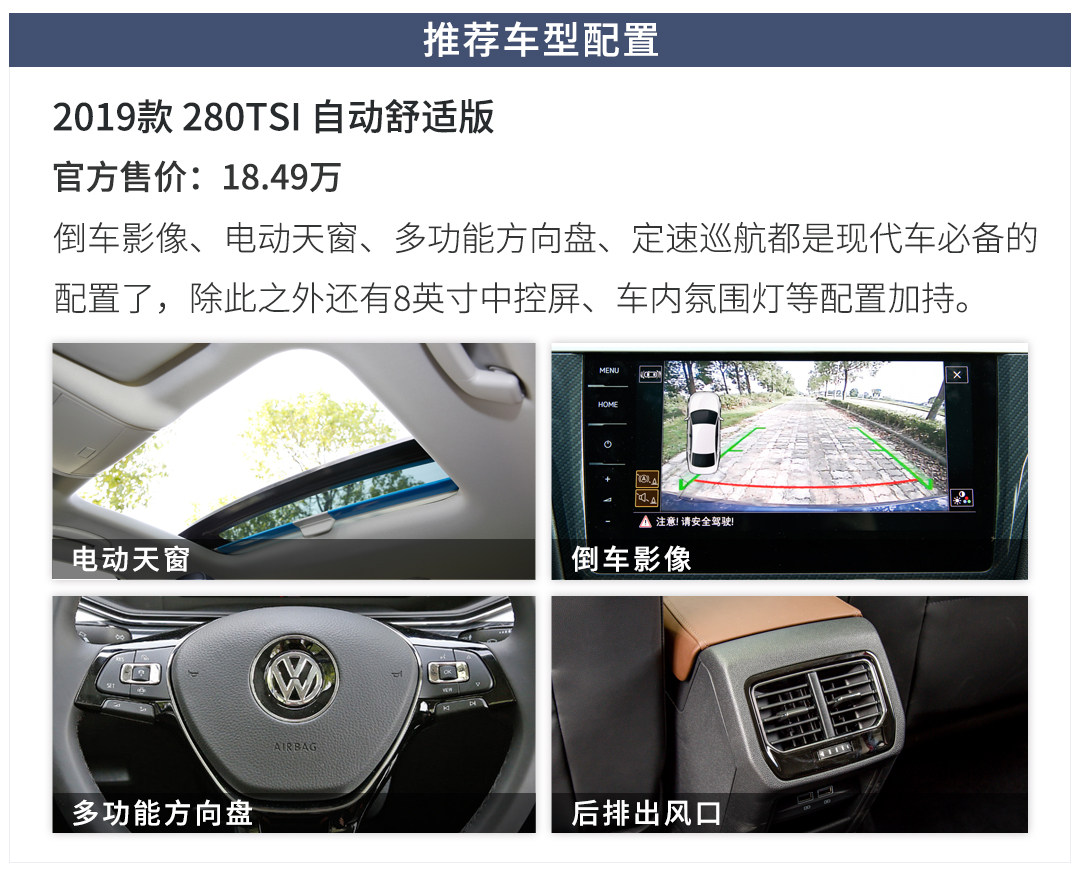 所以最后还是推荐280TSI自动舒适版,首先动力对得起它的外观,其次配置到位,该有的都有了,唯一遗憾就是没有配全液晶仪表,而且也不可以选配。