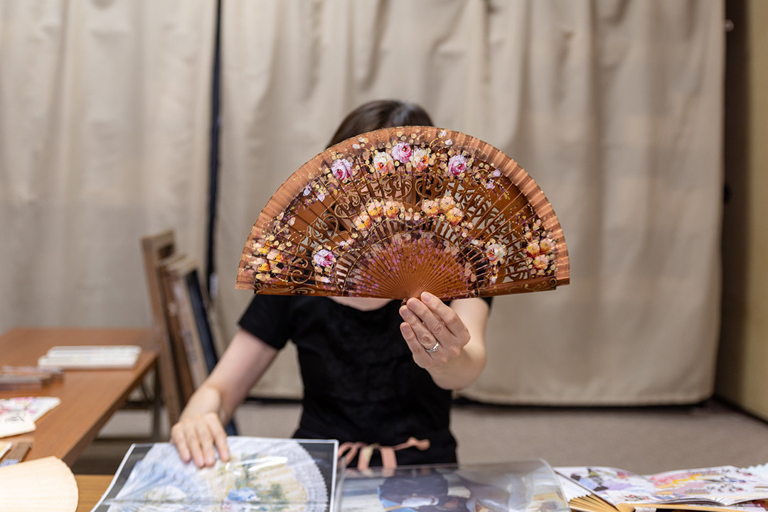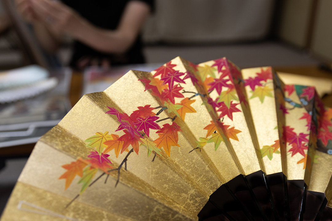 精致的京扇会在扇面上装饰金银箔,莳绘,织绣,尤其以白檀,桧木为扇骨的京扇子更是极品。与团扇不同,京扇子的特点在于其可以折叠成较小的形状,这完全仰仗于制作师傅的精湛技艺。京扇子的制作分工细腻,需要经过二十多道工序,制作流程主要分为以下三种:扇骨的组装作业、贴纸绘画作业、以及最后将两面对合粘贴的作业。都是完全的手工活,要的就是一个细致。让每把京扇都能成为艺术品,这也是一种“匠心”。