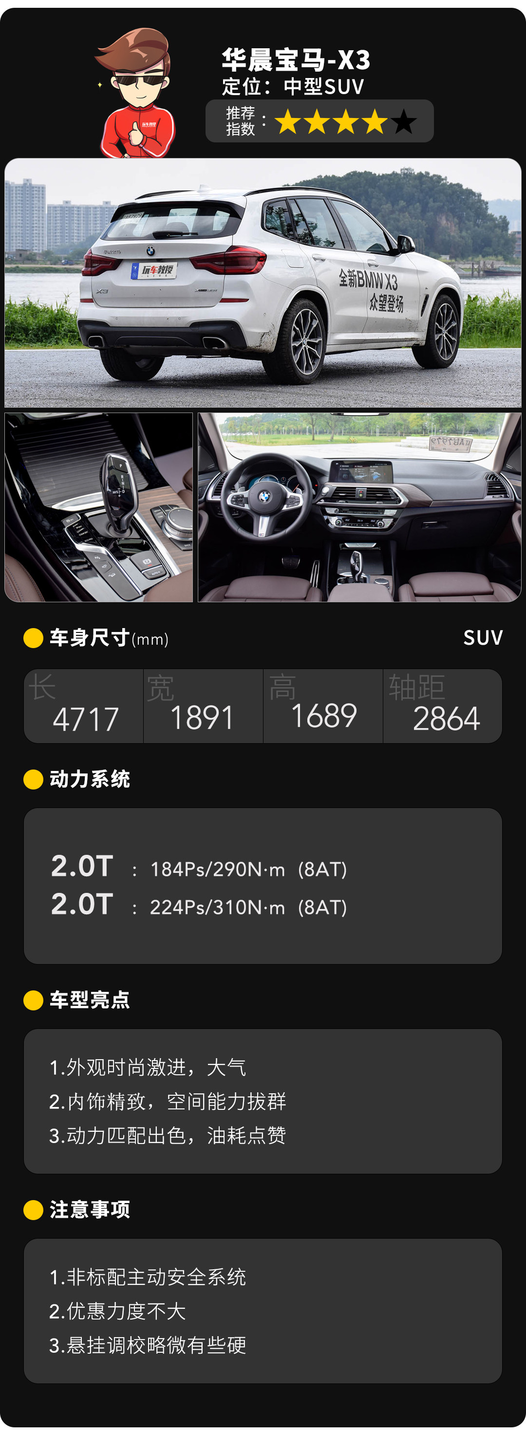 当然了,升级换代后宝马X3除了操控性和燃油经济性有明显的提升外,更是凭借2.0T强劲有力的发动机、优秀的空间表现、精致的内饰以及极好的驾乘感受等优势在豪华中型SUV行列中脱颖而出。更为值得一提的是全新的宝马X3还可以根据需求选装竞技运动套件。