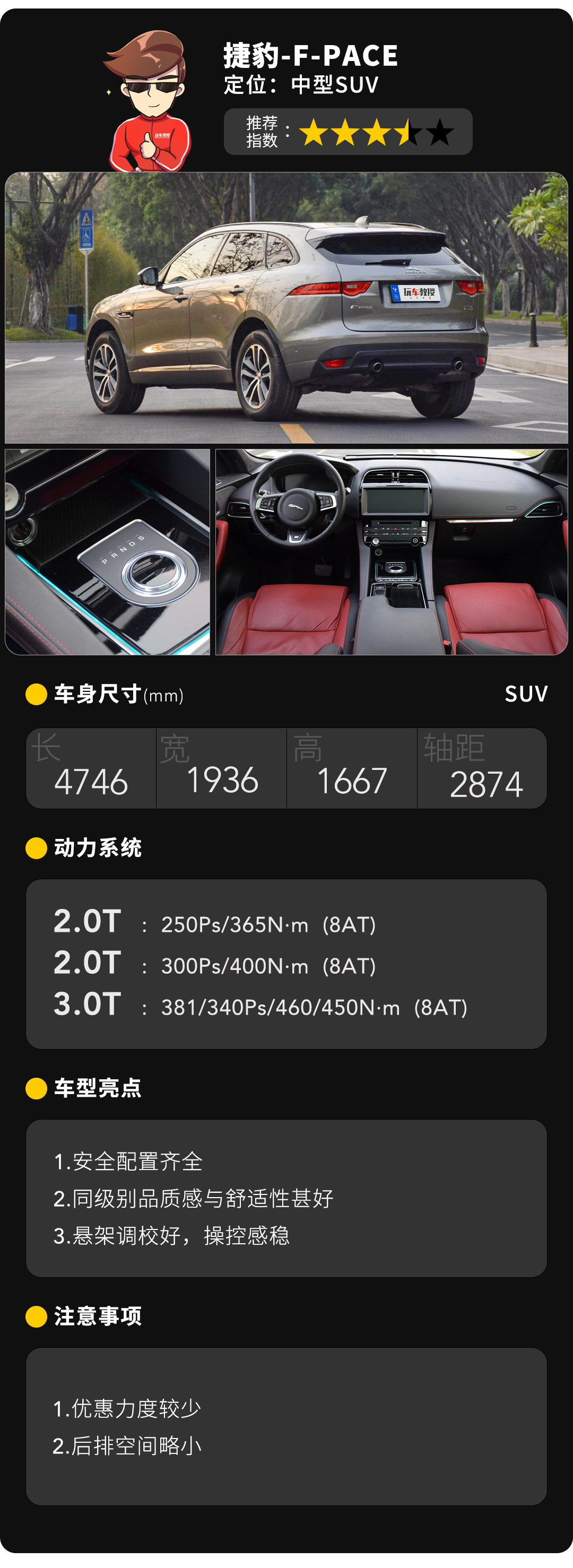 捷豹F-PACE最早于2015年面世,当年一上市就备受消费者的喜欢,更是依靠其独特的性能表现、舒适性以及价格,被誉为当时均衡感做得最好的SUV,至于现款的F-PACE也依然延续了其英伦风格的性能美感,运动特性表现力十足。