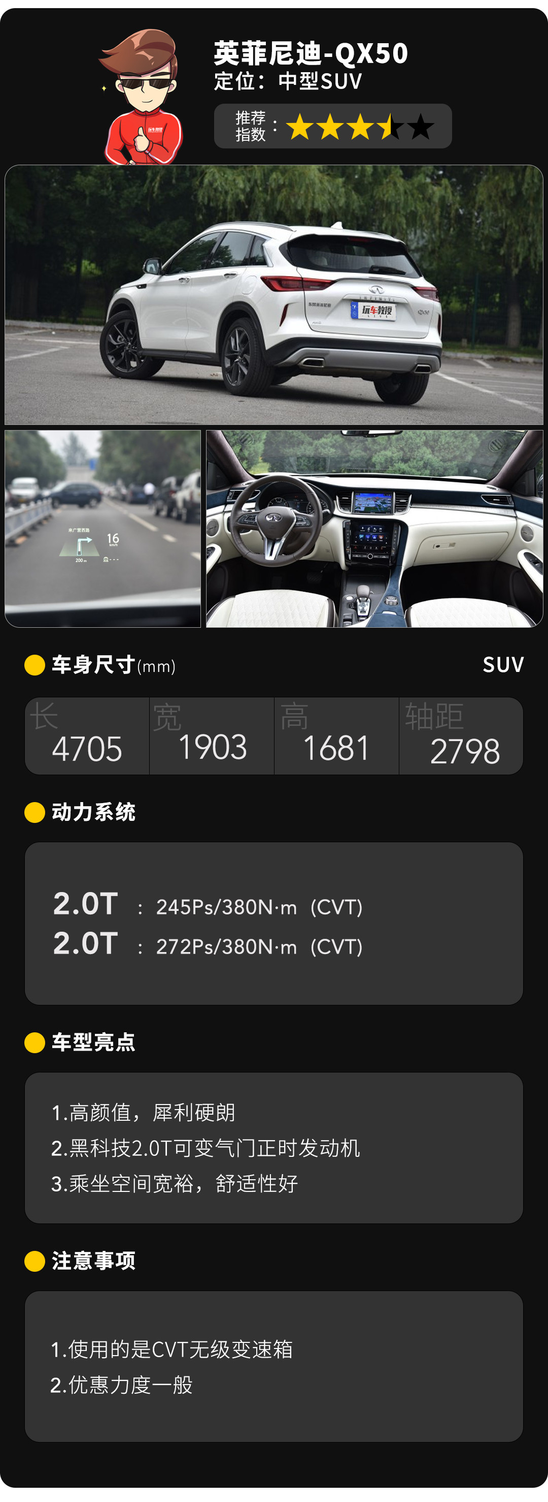 其实新车QX50身上最大的亮点还是在其身上首次出现的黑科技“2.0T可变气门正时涡轮增压发动机”,这款发动机能够通过实现压缩比从14:1到8:1的几何变化来提高车辆的燃油经济性,而与此同时,也保证了其在低速行驶时具有更好的扭矩输出。