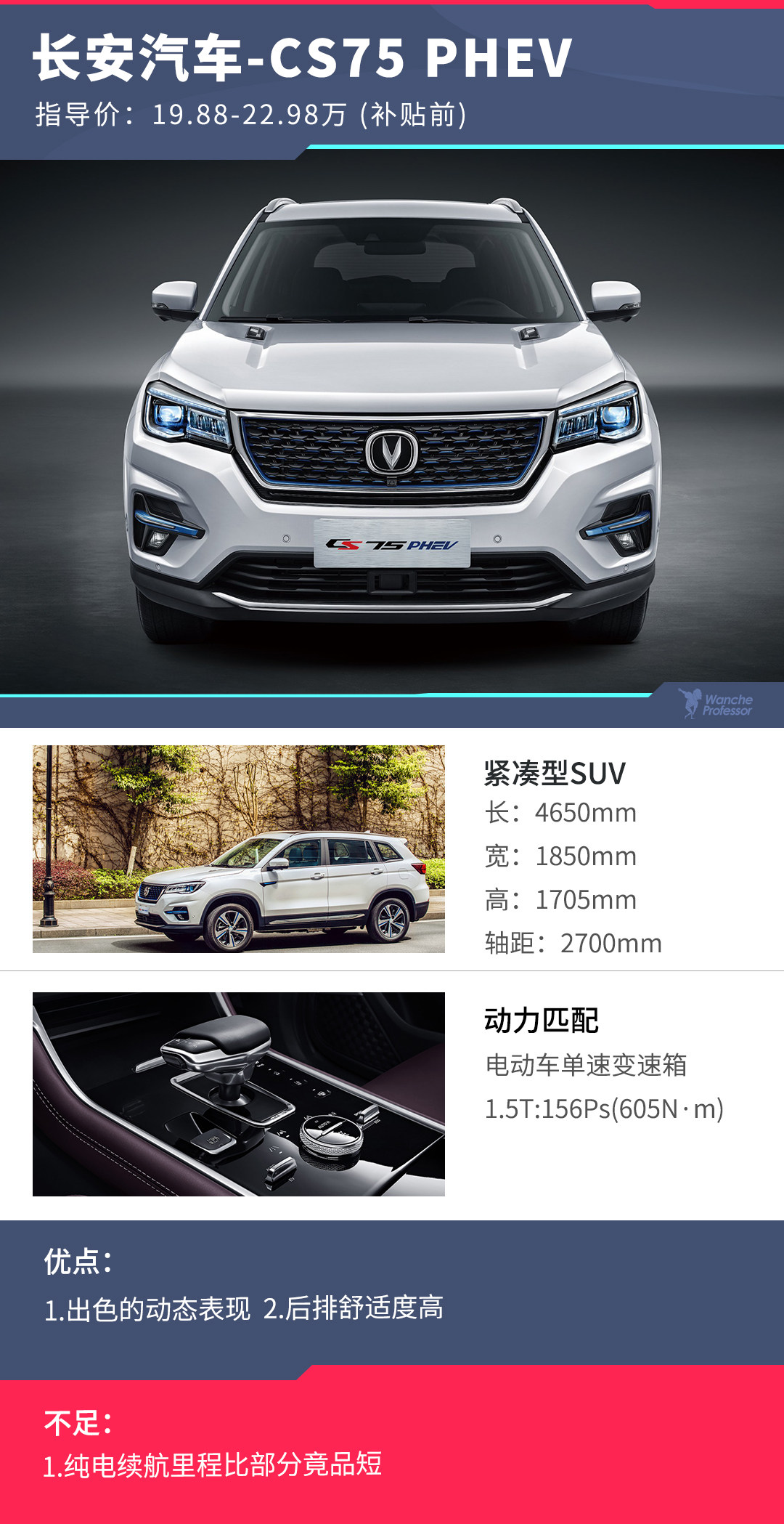 由于存在这一定的技术门槛,目前国内的插电式混合动力车型并不算丰富,而且主要被比亚迪和上汽这两个厂商瓜分。这次CS75 PHEV的出现,势必会让局面发生变化。