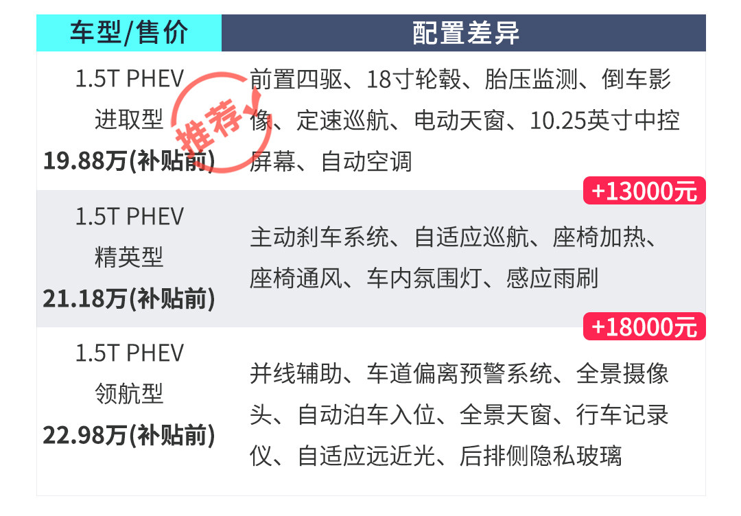 9月12日,长安CS75 PHEV(插电式混合动力)车型正式上市,这次新车一共推出3款车型,补贴前的官方售价区间为19.88-22.98万元,而补贴后统一价格为16.58-19.68万元。在目前大政策的环境下,插电式混合似乎是最佳的选择,那这次推出的3款怎么买才划算?教授告诉你答案。