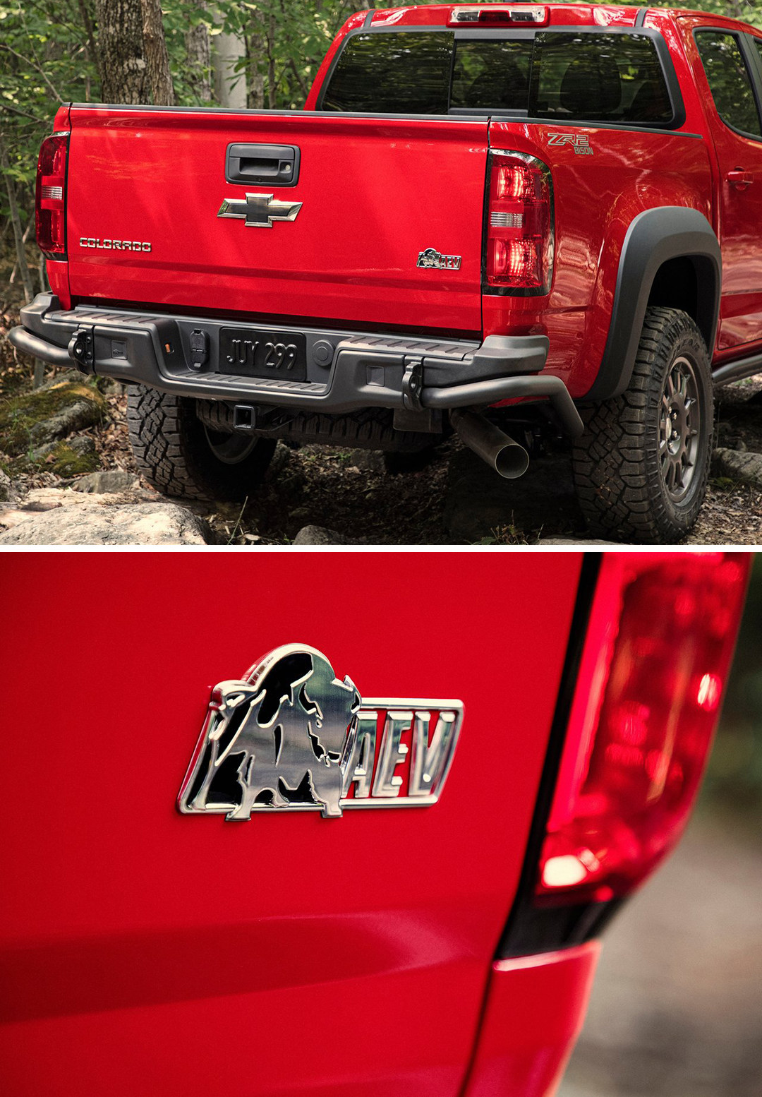 “黑领结”logo在尾部得到了回归,单边单出的排气斜斜地布置于车尾一侧,看似潦草,却很符合它狂放不羁的性格。由于此版车型为雪佛兰联合美国远征车队(American Expedition Vehicles,简称“AEV”,美国的一家越野售后配件供应商)共同打造,为了纪念伙伴的贡献,还特地在车尾右下角贴上了“AEV”标识,也借此表明它与众不同的身份。