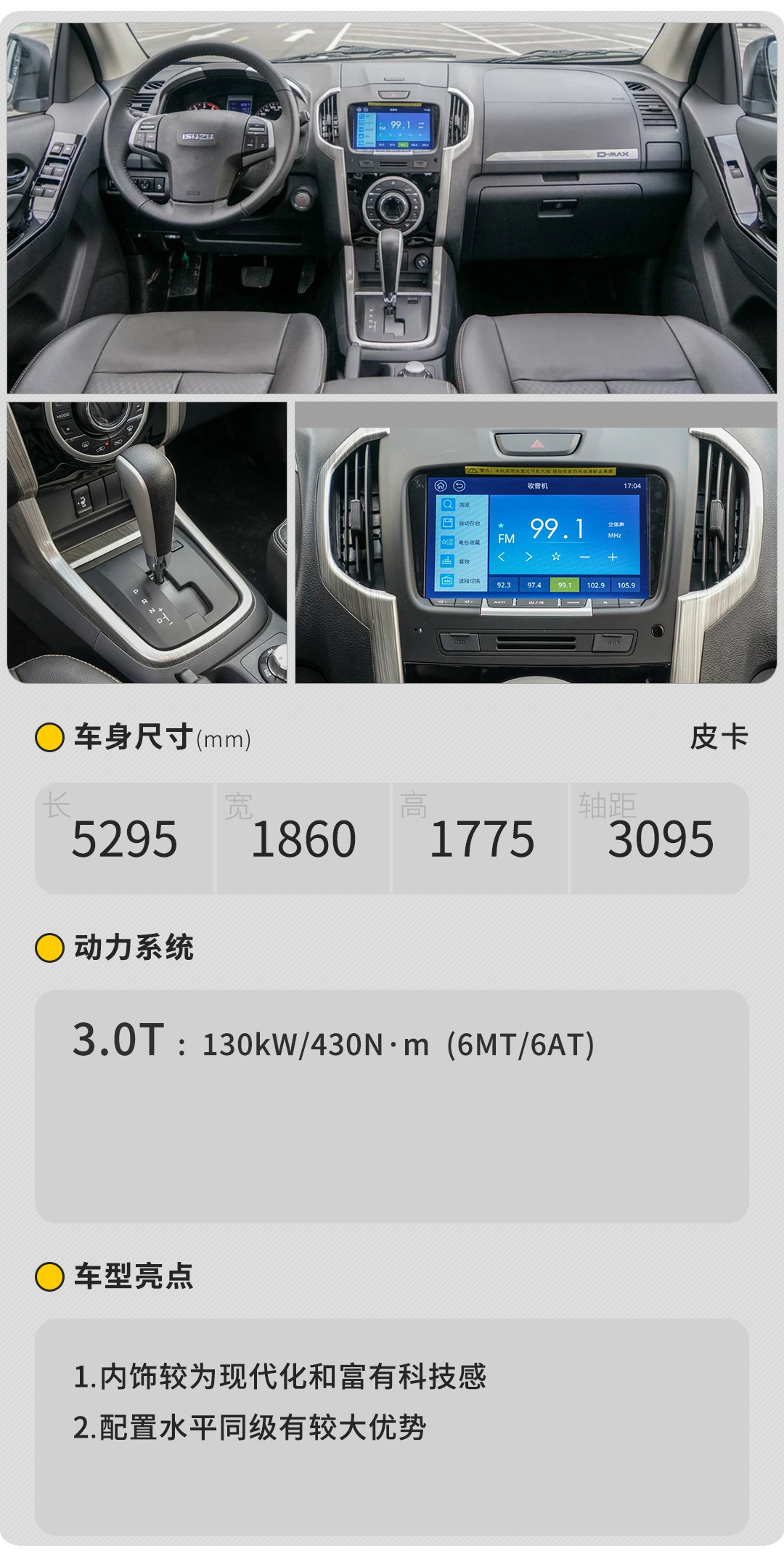 作为一款当代的皮卡,D-MAX没有固步自封,内饰相对同级而言更具现代气息和科技感,配置装备更是丰富多样。3.0T的柴油发动机低扭输出强劲,让你在有较大载重需求时得心应手。如果你需要一款时尚前卫的皮卡,对配置要求比较高,心里对五十铃品牌也比较认可,那D-MAX将是你很好的选择。而且目前该款车优惠不少,喜欢的朋友不妨到4S店咨询一下。