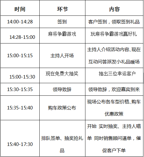 由厂家领导在现场一口价公布优惠价格,采取的是综合优惠报价,结合所有礼包优惠, 进行现场轰炸式优惠公布方式,让客户真真切切的感受到优惠。现场采取统一格式的简易合同模板,帮助销售顾问快速签单;活动现场签单时间限时30分钟。30分钟后结束签单,活动结束取消现场所有优惠。要利用现场排队签单的气氛进行订单的签署;现场采取一口价的报价方式,现场不议价。