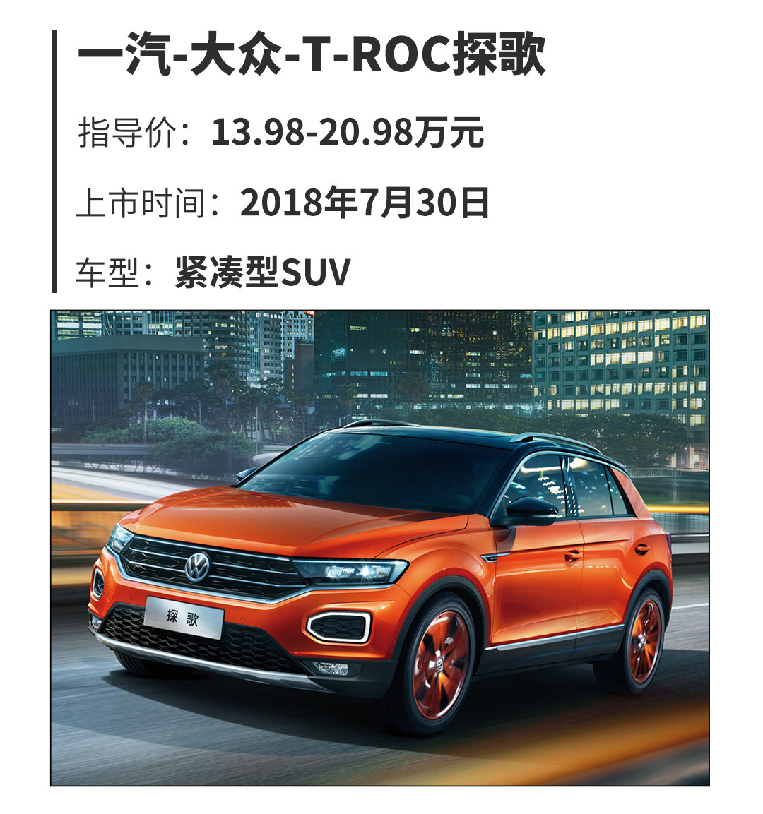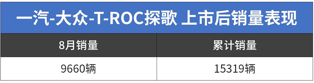 上市后的表现 :7月底才正式,8月单月的销量已经达到9660辆,而累积销量更是破1.5万,这可以说明正式上市前已经有不少人预售了,而且7月中旬上市的T-ROC探歌限量版也是颇受欢迎。一汽大众的首款SUV车型,注定少不了跟随者的步伐。上市1个月就成功地成为大众卖得第二好的SUV,真的不得不佩服“大众光环”。