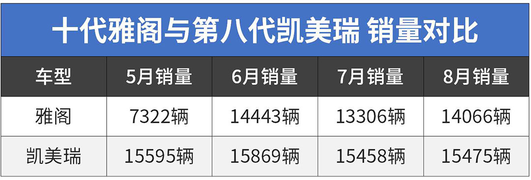 上市后的表现 :十代雅阁上市后,直接将雅阁的月销量翻了不止一倍,月销量已经逼近1.5万辆。继大众的两款中级车(帕萨特、迈腾)之后,与换代不久的凯美瑞争夺着合资中型车第三名的位置,雅阁的销量数据越来越接近凯美瑞,数字在8月份已经十分相近,不相上下,竞争激烈。