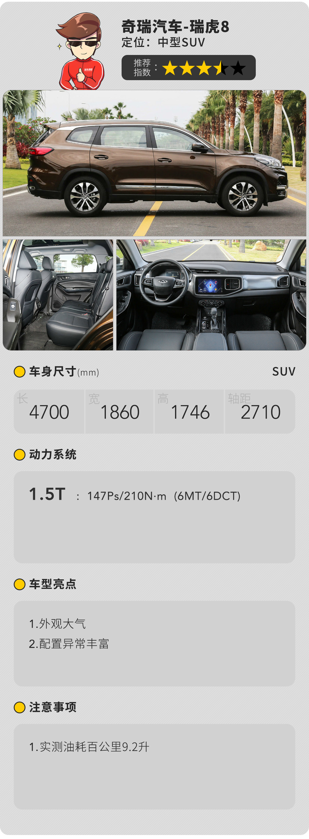 作为奇瑞家族SUV中的旗舰产品,瑞虎8有着更大的车身尺寸,可选的7座布局也让它在面对竞争对手时更多了几分自信。这套动力总成总有人说“肉”,但实际测试下来,哪怕用的是ECO经济模式,市区里一般情况踩一半油门就基本够了。对于综合实力很不错的瑞虎8来说,教授推荐尊贵型车型,更齐全的安全配置与实用配置,虽然里面有些配置可以后期靠改装,但原厂的品质也更有保证不是吗。