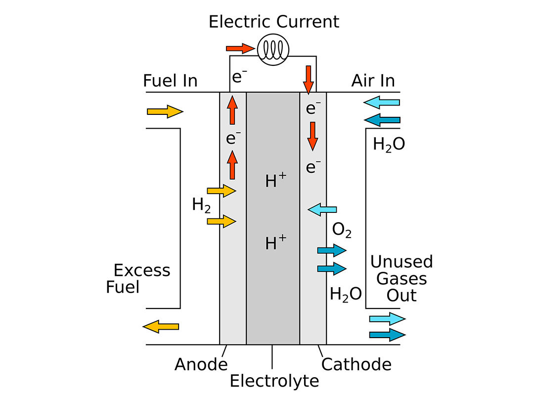 氢燃料电池系统能够通过含有催化剂的转化膜触发氢气与氧气发生化学反应,释出电子和水,其中产生的电子就能积聚起来用作驱动电机的能量来源,而唯一的废弃物就是纯净水。由于氢燃料电池车的氢燃料并不直接参与驱动,仅仅用作生产电能,因此可以将氢燃料电池车视作自带氢能发电厂的纯电动车。