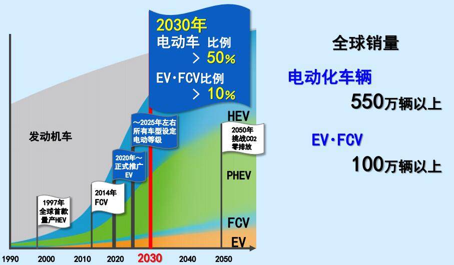 在丰田的车辆电动化里程碑中,丰田计划在2020年正式引进量产的纯电动车型,首发车型为基于TNGA平台的C-HR和IZOA;而在丰田的2025年规划中,所有丰田车型均具备电动化版本可选;到2030年,所有在售的丰田车中电动化汽车占比达到50%,其中EV(纯电动车)和FCV(燃料电池车)占比10%以上,换算为销量电动化汽车合计550万辆、完全不使用汽油的EV和FCV共100万辆以上。