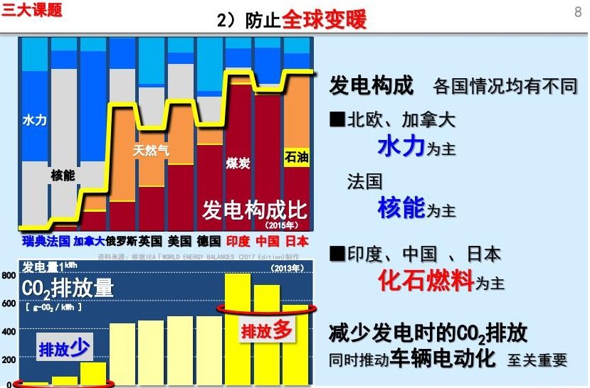 已经具备了技术,但是迟迟并未生产,在丰田看来,他们的使命并不仅仅是销售汽车而已,自丰田创立以来他们便以“环保”、“安全、放心”、“可持续发展的社会”、“感动”为行动方针,这是丰田一贯坚守的信条。久保馨认为,只关注行驶过程中的CO2是没有意义的,在电动车零部件材料制造、车辆制造、车辆维修和废弃环节,落后的能源供应和生产方式一样无法避免环境污染,最核心的问题便是大量国家依旧使用化石燃料供应能源,大量消耗化石能源会导致大气中的CO2浓度急剧上升。