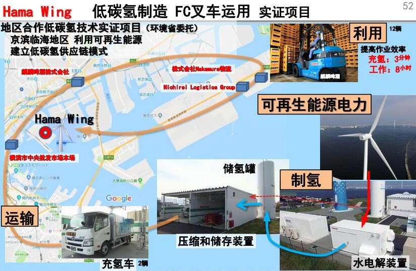 在日本京滨的Hama Wing实证项目中,丰田利用可再生的风能发电并电解水制氢,进而压缩和储存将氢能源运往区域内的工厂、市场和仓库供叉车、货运车等工业设备使用,这便是低碳化制造的一次创新。