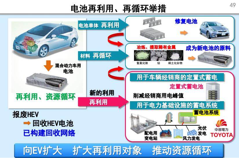 此外,针对电动化汽车零件的报废和回收课题,丰田自普锐斯发售便开始构建回收网络,对混合动力车的电池进行再利用和再循环。除了修复电池的再利用和材料的再循环之外,还可以用作经销商电源的定置式蓄电池、用于电力基础设施的蓄电系统,今后还将拓展到EV用电池上,并将再利用扩大到工厂、发电站等地,积极推动资源循环。