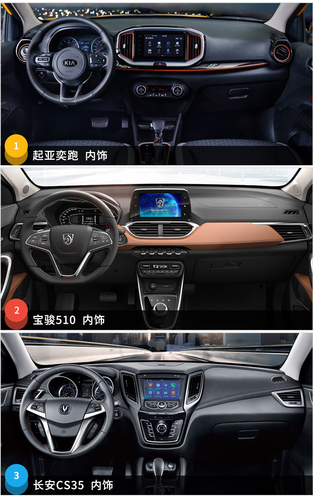 首先奕跑的内饰设计是与外部版本有所差别的,虽然同样有许多活跃的颜色点缀,但运用了更多圆润的线条,整体效果就是年轻范儿,方向盘设计也有有跑味。宝骏510则采用了很多的皮质包裹来营造出小小的高级感,在加上水晶状的换挡旋钮,又多了几分精致。长安CS35的内饰就较为复杂,线条错综复杂,且按键布局也不够精简。