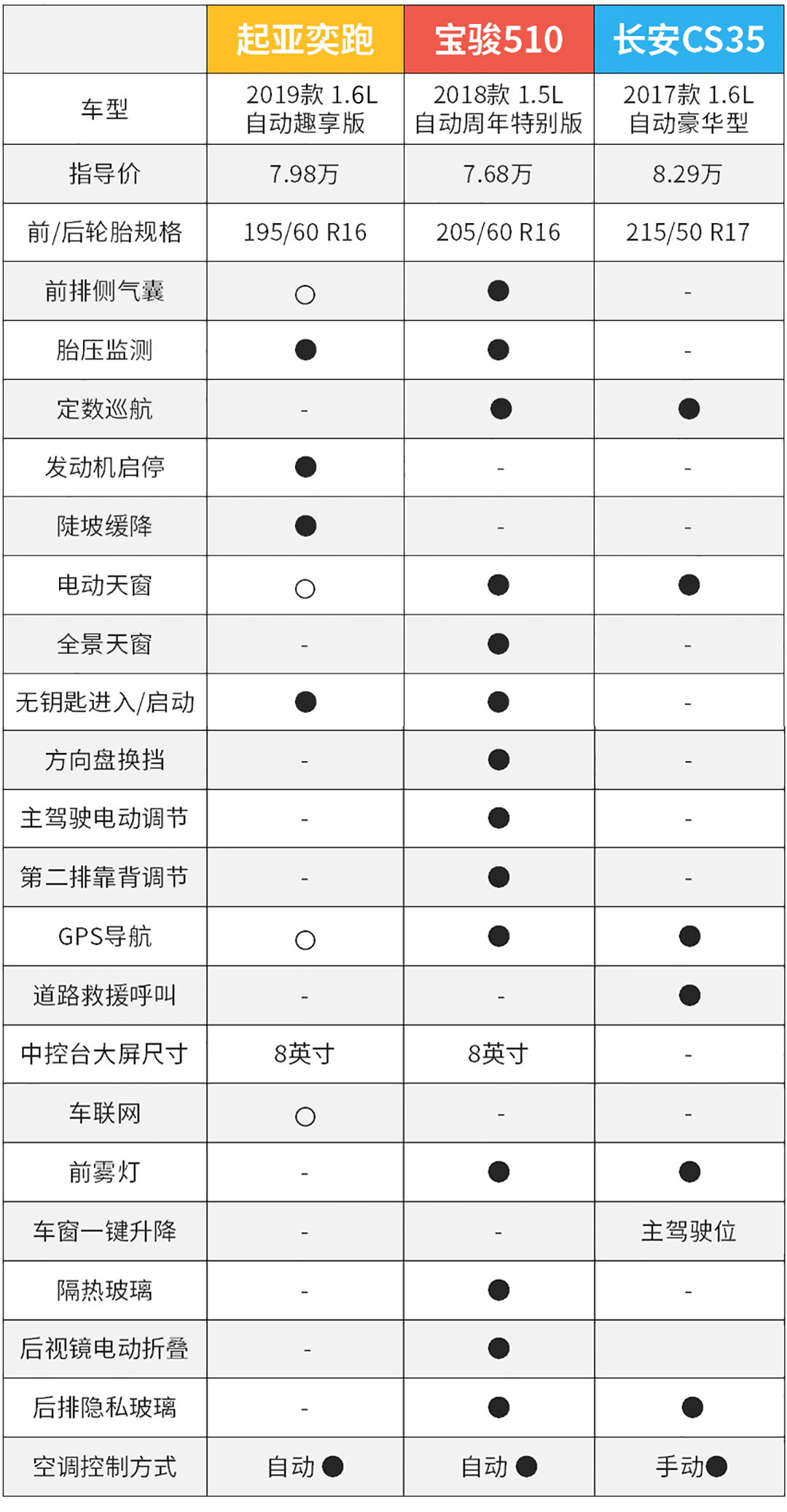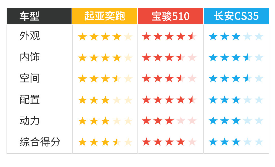 基于三款指导价比较接近的车型进行配置对比,这时奕跑的一些劣势就显而易见了,比如天窗,GPS,和车联网都要需要选配的,不过除此之外,奕跑的许多配置都已经比较到位了,比如胎压监测,倒车影像,多功能方向盘,中控大屏这些该有的还是会有。而宝骏510的配置毫无疑问就是完胜了,就一个全景天窗,就更对手拉开了不少差距,而且,目前宝骏510是普遍有几千到一万不等的优惠幅度的,想要性价比,怎么选?你懂的。