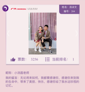 9月18日-9月25日,“寻找幸福新娘”活动即将进入晋级赛评选阶段,届时广汽本田广州区域后台将根据有效票数评选出票数前30名参赛者晋级。