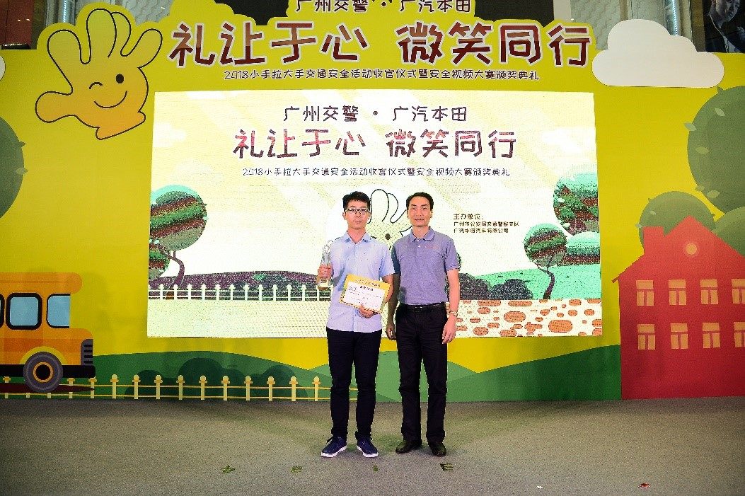 广汽本田汽车有限公司副总经理袁小华为冠军获得者颁奖,获奖代表表示:“很开心能获得本次大赛冠军,作为一名驾驶者,我希望通过参赛视频提醒广大驾驶者上下车要注意车后行人或骑车的人,将正确的下车礼仪小细节传递给更多的驾驶者朋友。这看似一个简单的礼让动作,却能有效避免意外的发生。”