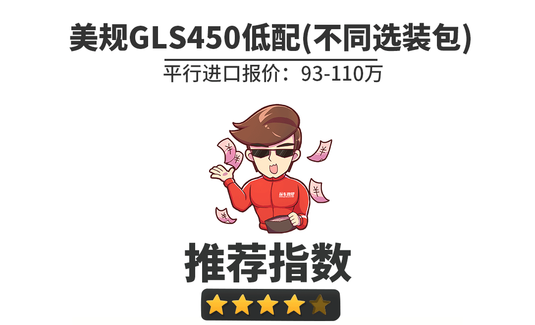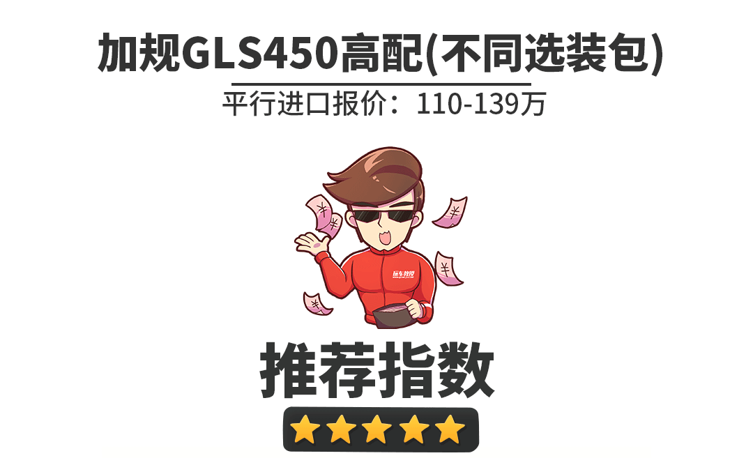 为何推荐:有的人可能会问,如果消费者购买一辆和中规GLS320配置差不多的美规GLS450,外加几千到两万不等的质保险,价格不就和自带质保的中规车相差不大了吗?是的,这样的确会让双方价差减小,但您也不要忘了,花同样价钱,美规的尾标是450,中规只能买320,连400的尾标都够不到,而中规400起售价高达115万,更是全系没有450尾标。