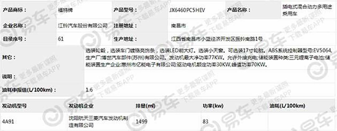 有媒体曝光了一组江铃福特Territory插电混动版的申报信息,新车搭载1.5L发动机与电动机组成的插电式混合动力系统,百公里油耗为1.6L。新车外观与燃油版车型保持一致,并没有发现存在专属装饰或套件。作为江铃福特联合打造的一款全新SUV,大家都十分期待Territory的表现,面对国内的高油价,这台百公里油耗为1.6L的插混车型能否戳中消费者的痛点?值得期待。(图片来源:易车)