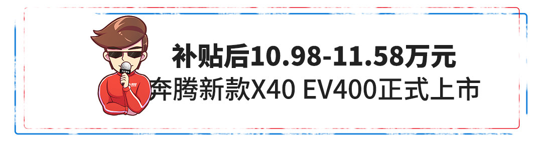 2019款奔腾X40 EV400正式上市。新车共推出两款车型,厂家指导价为18.38-18.98万元,补贴后售价为10.98-11.58万元。X40 EV400 NEDC续航里程为310km,60km/h等速续航里程可以达到400km。新车在前格栅、前包围、内饰等地方加入了专属的蓝色元素。奔腾X40 EV400在价格以及续航方面表现比较均衡,可以满足日常市内代步需求。