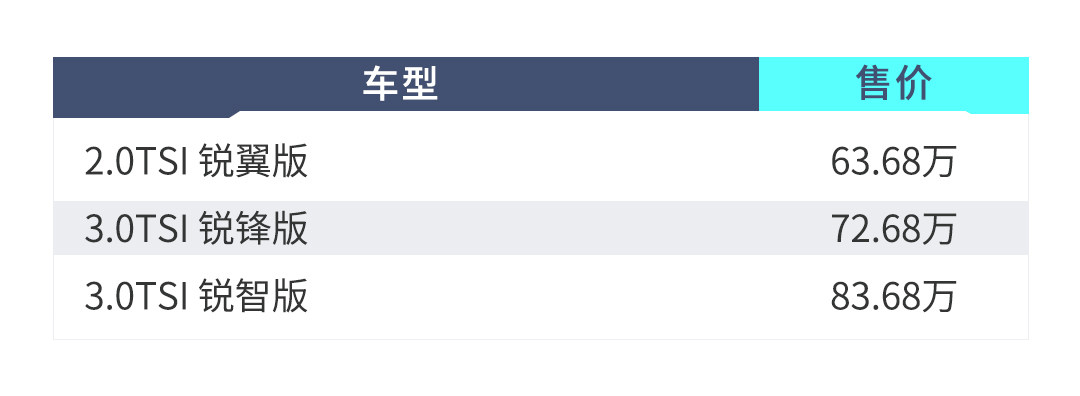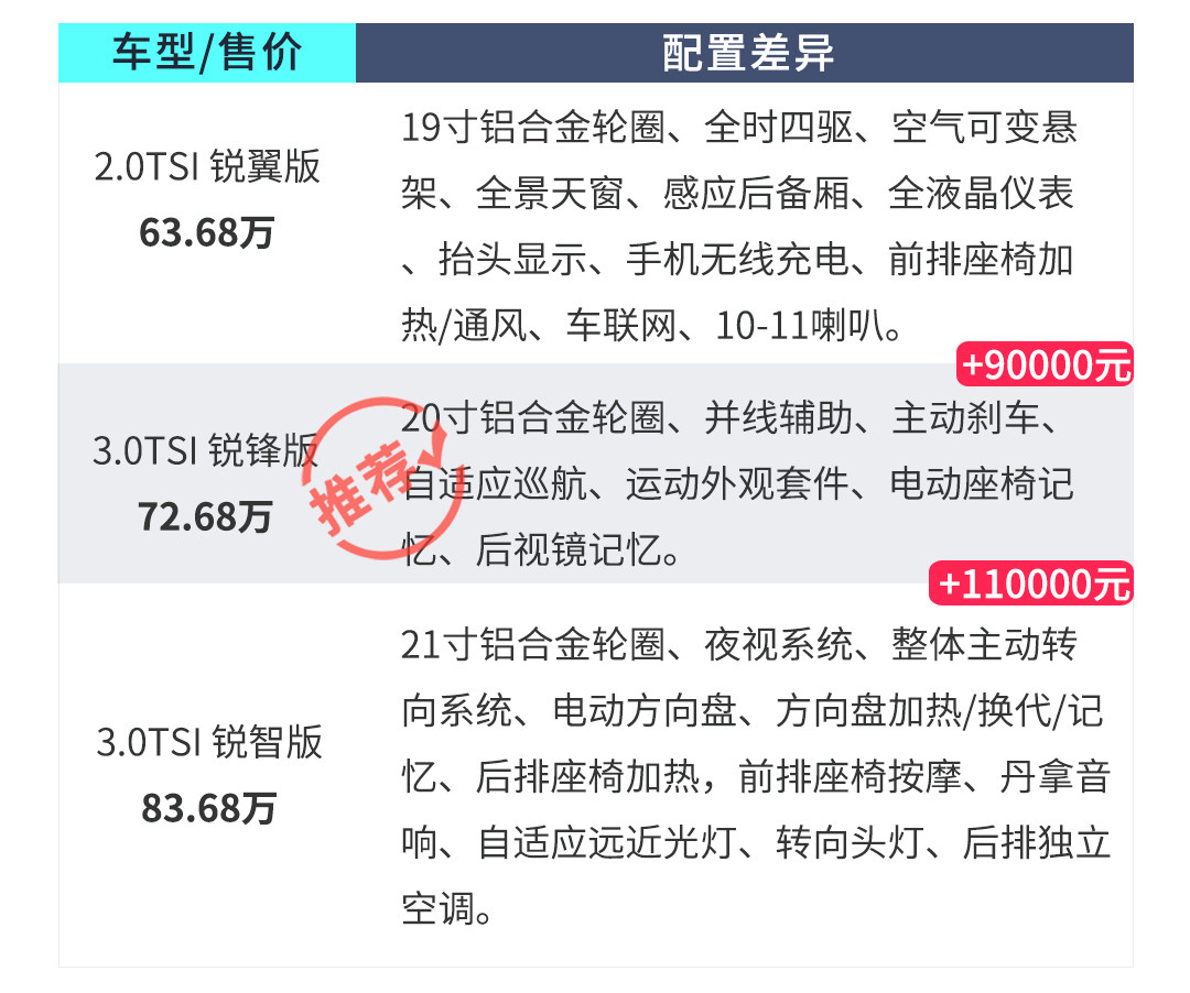 所以最终教授还是认为3.0TSI锐锋版是最值得推荐的,这款就真的是应有尽有了,不过最核心的,还是V6的底气吧,再不买,以后可能真的没机会了。如果是你,是否愿意多花9万,为6缸发动机+20寸轮圈+运动外观套件买单?