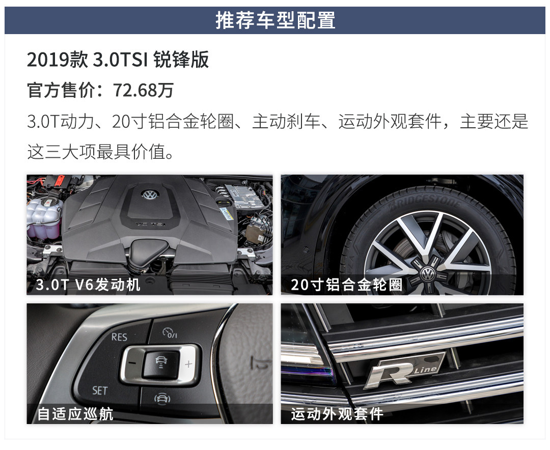作为2.0TSI入门车型,虽然配置到位,但是其实价格是完全不够吸引的,因为旧款3.0T的入门车型基本也是这个价。其次是这款2.0TSI车型没有运动外观套件,不过这还不是最重要的,因为其实没有运动套件差距不会太大,最接受不了的是,2.0TSI车型的19寸轮毂样式实在是太掉档了。当然,如果你愿意接受在这么一款大众旗舰SUV搭载四缸发动机,那其实最低配也是不错的。