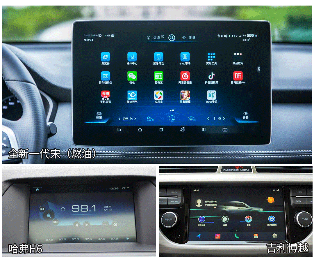 而在人机交互功能上,哈弗H6除了部分多媒体如听音乐、导航之外就没有太多功能,整体还停留在上一代的操作思维中。博越则先进一些,搭载GKUI智能系统(对比车型需选装),可实现语音控制、信息资讯、安全保障等功能,还可控制空调并实现CarPlay等手机互联功能,整体实用性稍强,但相比全新一代宋的DiLink智能网联系统还是逊色不少。