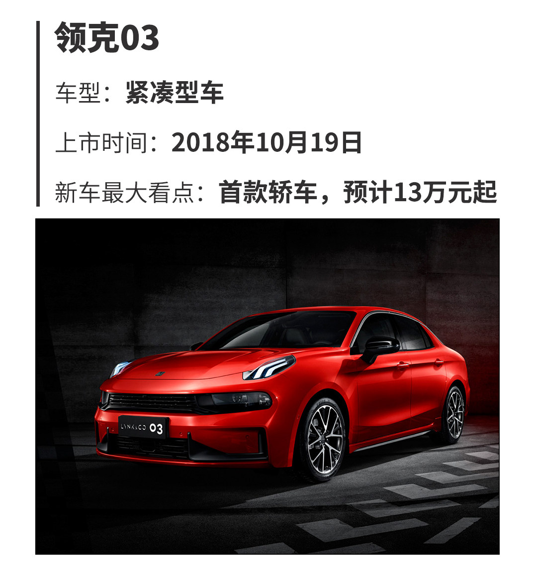 领克旗下首款轿车,也是众多消费者期待的一款新车,设计上延续了01和02的家族式设计方式,看上去也十分的熟悉,只是由于轿车造型的关系,会使得这种设计感显得更加运动与个性,而且侧面设计更加协调,就凭借此外形,领克03的粉丝便不会少到哪去;动力总成全系配备1.5T涡轮增压发动机,该套发动机已经在01和02身上有着优异表现,相信在愈发成熟的领克车型调校前提下,领克03的动态表现不会让人失望。