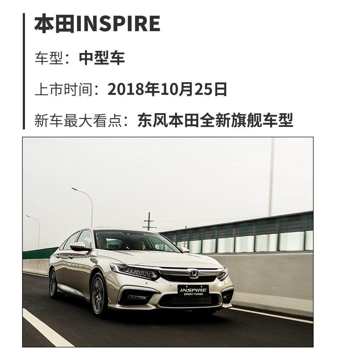 东风本田旗下一款定位较高的中型轿车,也是未来思铂睿的真正接替者,相较于同平台的广本雅阁而言,本身运动化氛围就十分浓厚的车身更进一步加强了运动风格的植入,使得整车看上去更加精神与激进,更符合崇尚运动个性的年轻消费者选择,而动力强劲的发动机,宽敞实用的车内空间等本身就具备的优点在这款车型上依然有着完整的提供,这也会使INSPIRE十分具有市场竞争力。