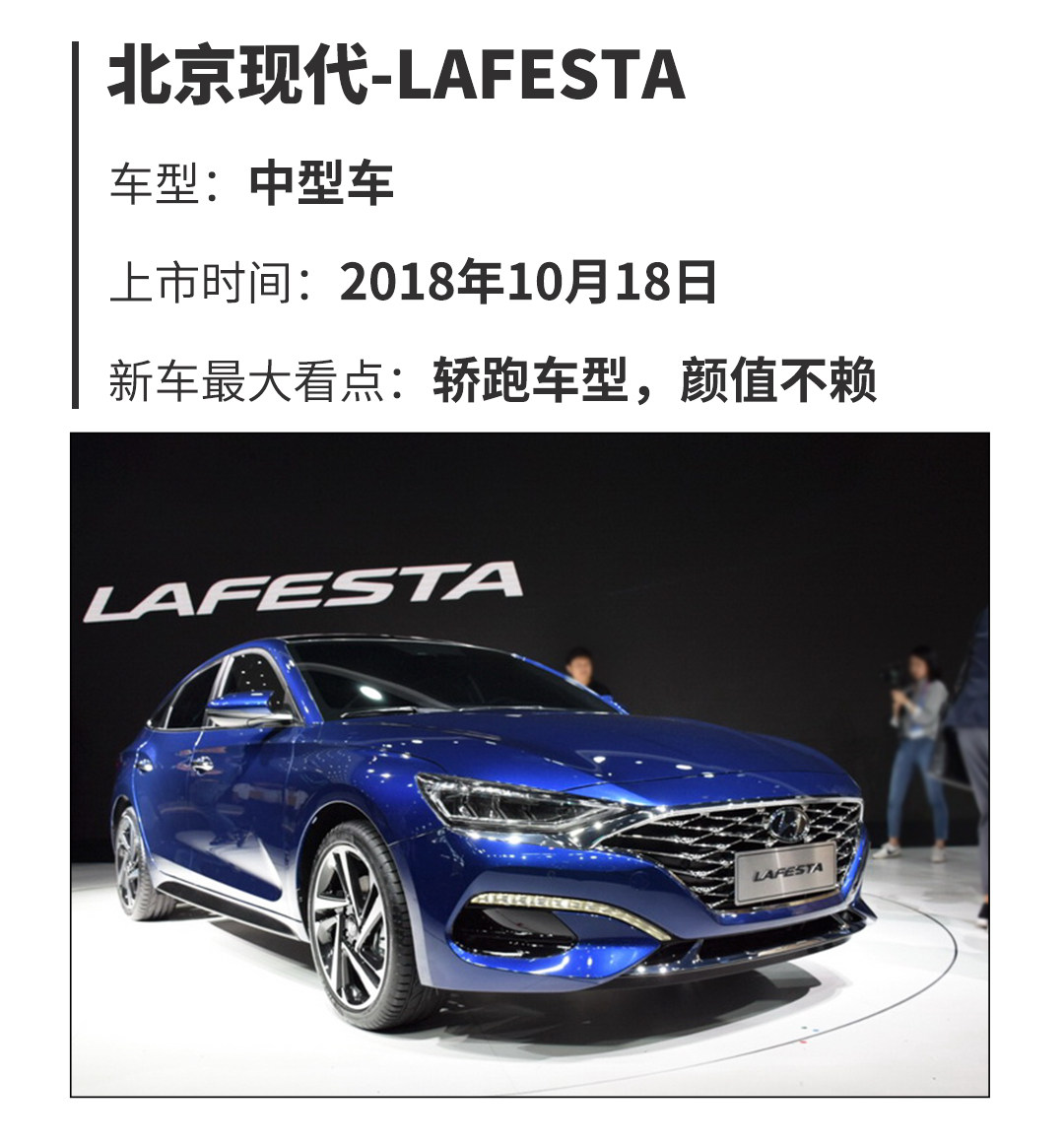 北京现代意图在品牌成立16周年之际推出的一款全新轿跑车。作为一款轿跑车,LAFESTA的运动造型十分强烈,而且前脸可根据不同的喜好选择不同的风格,也许它的到来会一定程度上挽救一下韩系车在华的销售颓势,毕竟在颜值即正义的时代,一款颜值不低的轿车总会有它的消费拥趸。LAFESTA搭载1.4T和1.6T两种排量的涡轮增压发动机,最高马力204匹,较高的性能参数也不免让人对它感到一丝期待。