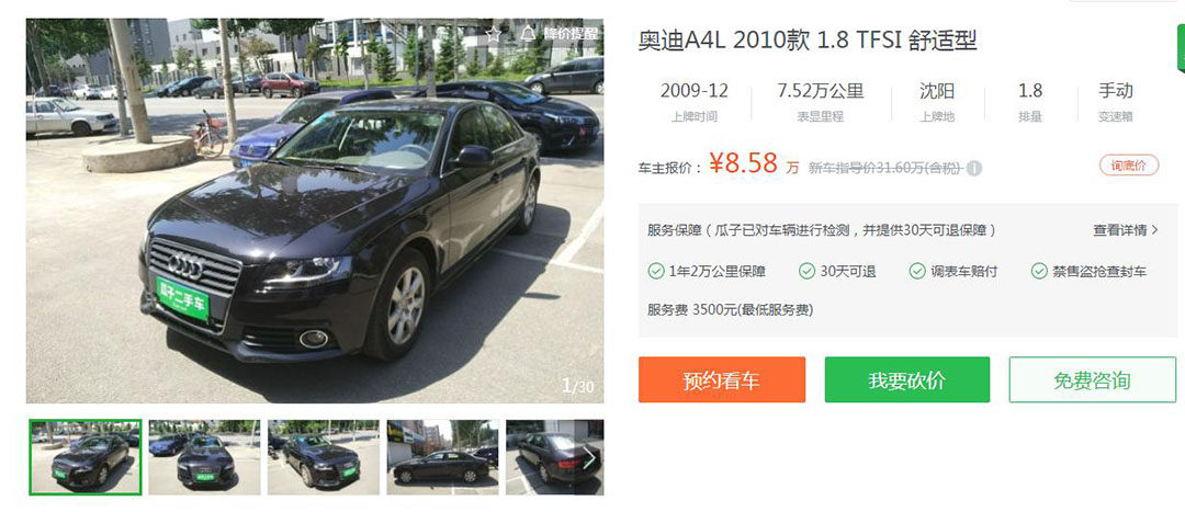 轮到BBA最后一个-奥迪了,奥迪的二手车价格较同级别的奔驰宝马要低一些,毕竟新车的优惠比较大,间接影响到二手车的价格。A4、A4L、A6L都是热门的选择,车龄为8年左右,价格为6-9万。除了烧机油的问题外,双离合变速箱也是个很大的问题(CVT不存在),油底壳漏油、波箱中端盖漏油、后端盖漏油,还有变速箱里面的双油封漏油等。