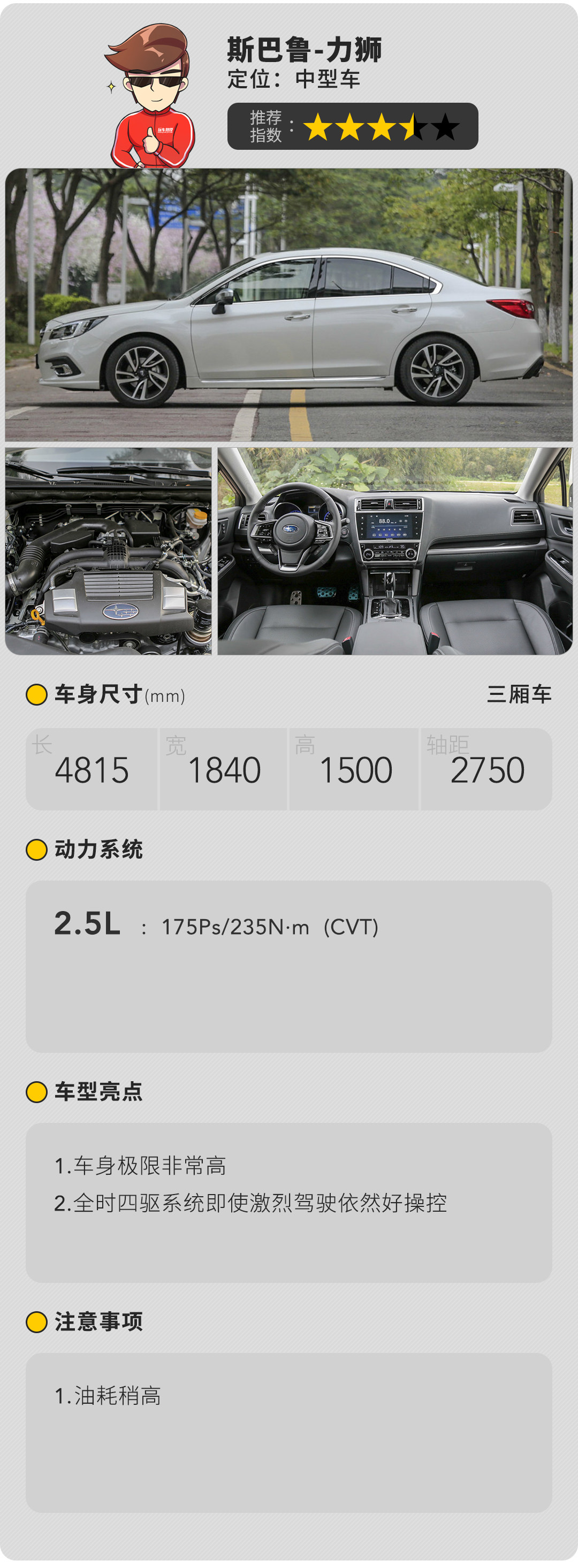 很多人都忘了斯巴鲁还有这么一款轿车,诚然 现款力狮已经跟以前那个动力强悍、甚至能在拉力赛上一展风头的力狮越走越远,这是不争的事实。但对于同级别天籁、雅阁等对手来说,力狮的全时四驱系统以及无比扎实的底盘让它在拥有十分高的极限,喜欢驾驶的年轻人不放更进一步去了解一下。