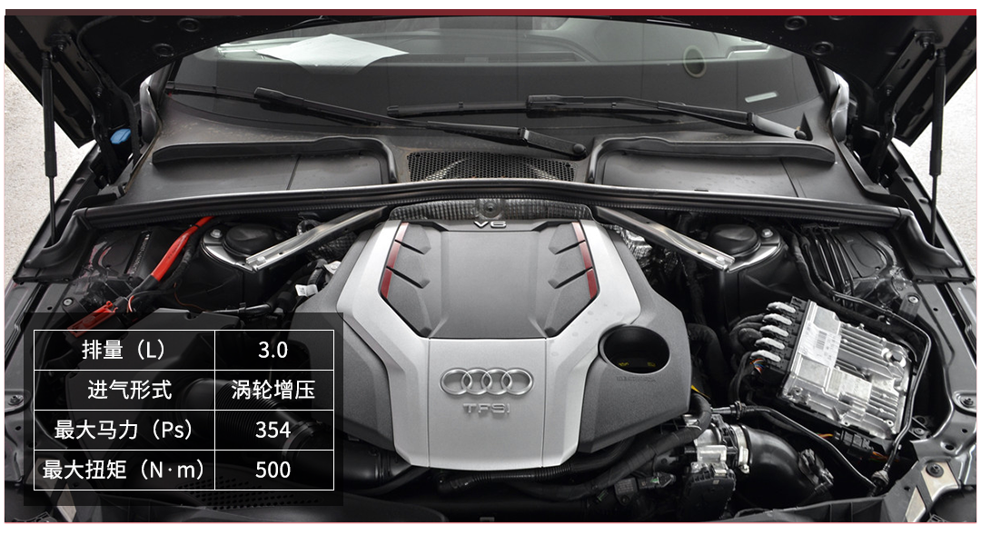 如今的S4已经演变成第六代车型,新车采用了型号为EA839的3.0T V6 双涡管单涡轮发动机,涡轮的布置方式与奥迪 4.0T V8 如出一辙,更短的进排气管道设计有利于降低动力迟滞。这台发动机最大马力354ps,最大扭矩500N·m。从动力参数看,这台3.0T并不算业内比较拔尖的水准,不过这么做是在为RS4留出空间。与发动机匹配的是ZF的8挡手自一体变速箱,Quattro全时四驱系统当然不会缺席。在这套动力总成和四驱系统的加持下,S4破百时间仅为4.7秒,奥迪一向比较保守,实际速度可能更快。