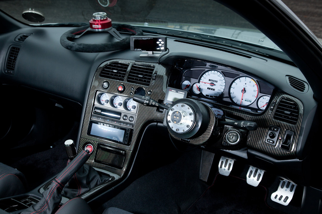 内饰方面,R34的进步也是巨大的,白底的仪表盘是亮点,使人的目光聚集在仪表处,更加注重驾驶,在中控台上方增加了一个显示屏,能够显示涡轮增压值,机油油温,水温等多种车辆实时数据。