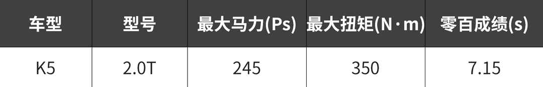 从实测数据能看到K5的表现还是相当给力的,虽然K5跑得快,但是100km/h-0的刹停距离为41m左右,表现一般。与这副2.0T发动机配合的是6AT变速箱,整体输出以平顺为主,每个动作都做得相当轻柔。