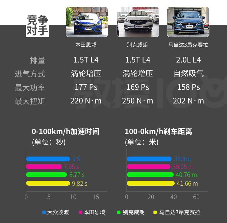 上半年我们测试同样采用1.4T高功率发动机加7挡双离合变速箱的奥迪A3时跑出了7.95秒的百公里加速成绩,而在测试相同动力系统的大众凌渡时却需要9秒,这样的差距还是很大的,究其原因,凌渡的起跑要保守一些,变速箱对转速的控制更加严苛,起步瞬间转速低于2000转,车子也没有挠胎之类的动作,起步比较平淡,而即便是切换到S挡关闭ESC,凌渡的换挡依然很保守,在5500rpm左右就已经换挡,整个加速过程也比较软。