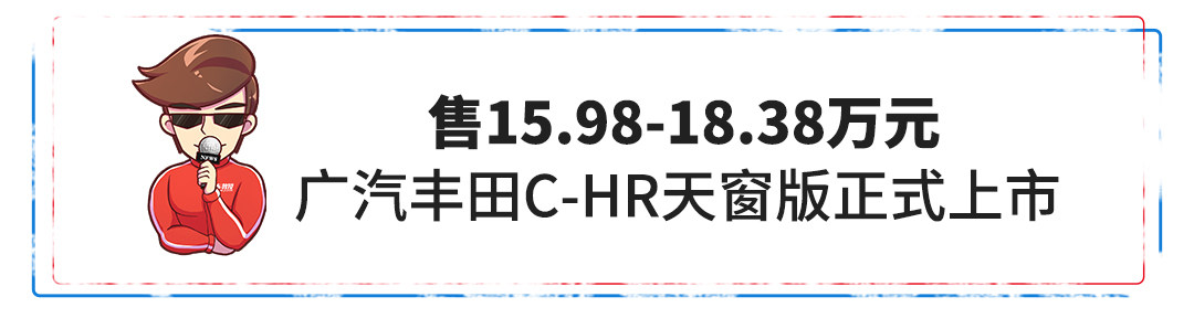 日前,广汽丰田C-HR天窗版正式上市,处入门的精英版外,原有各款车型均有天窗版,售15.98-18.38万元。据悉,国内市场是全球首个提供天窗版车型的地区。天窗的加入或许能缓解C-HR后排开扬感不足的问题,但作用有限。(配图为现款车型)
