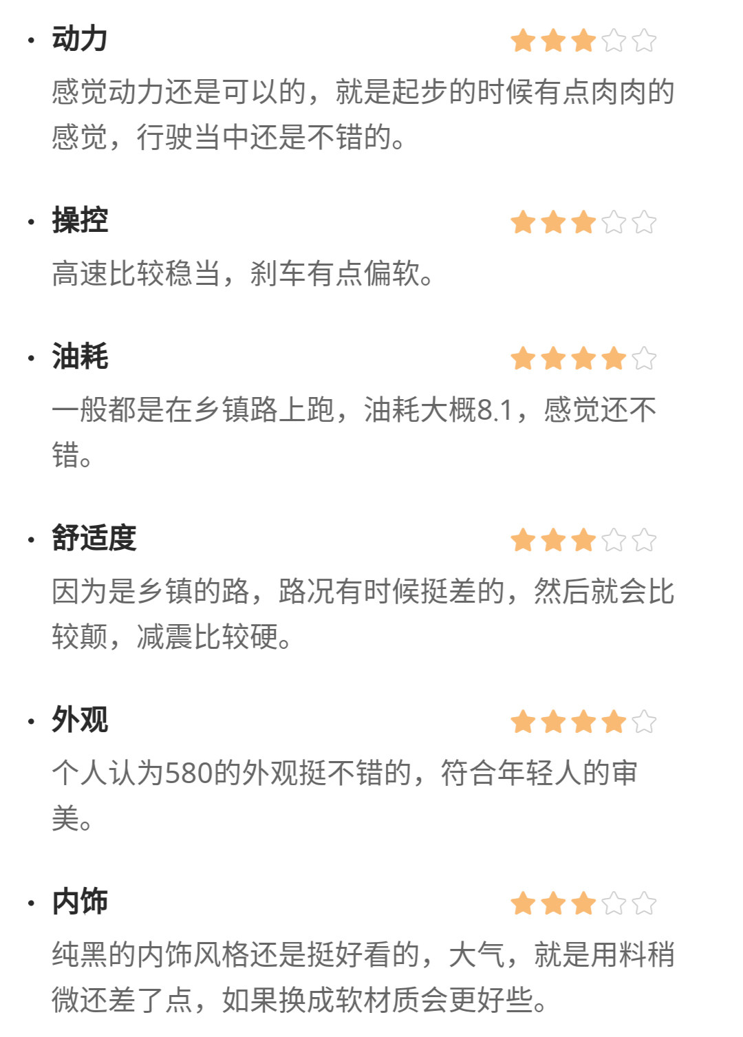 从这位比较有代表性的车主点评中,我们可以看出他的爱车在评价时已行驶了4580公里,因此对于车型的体验还是到位的,他购买的CVT车型油耗表现8.1L,而这个油耗是比较低的,其他用户反馈,如果长期在市区行驶的话油耗为9.5-10L每百公里,毕竟较大的车身尺寸、车重也有1510kg,但因为它使用了CVT变速箱,所以长途快速行驶时的油耗表现不错。