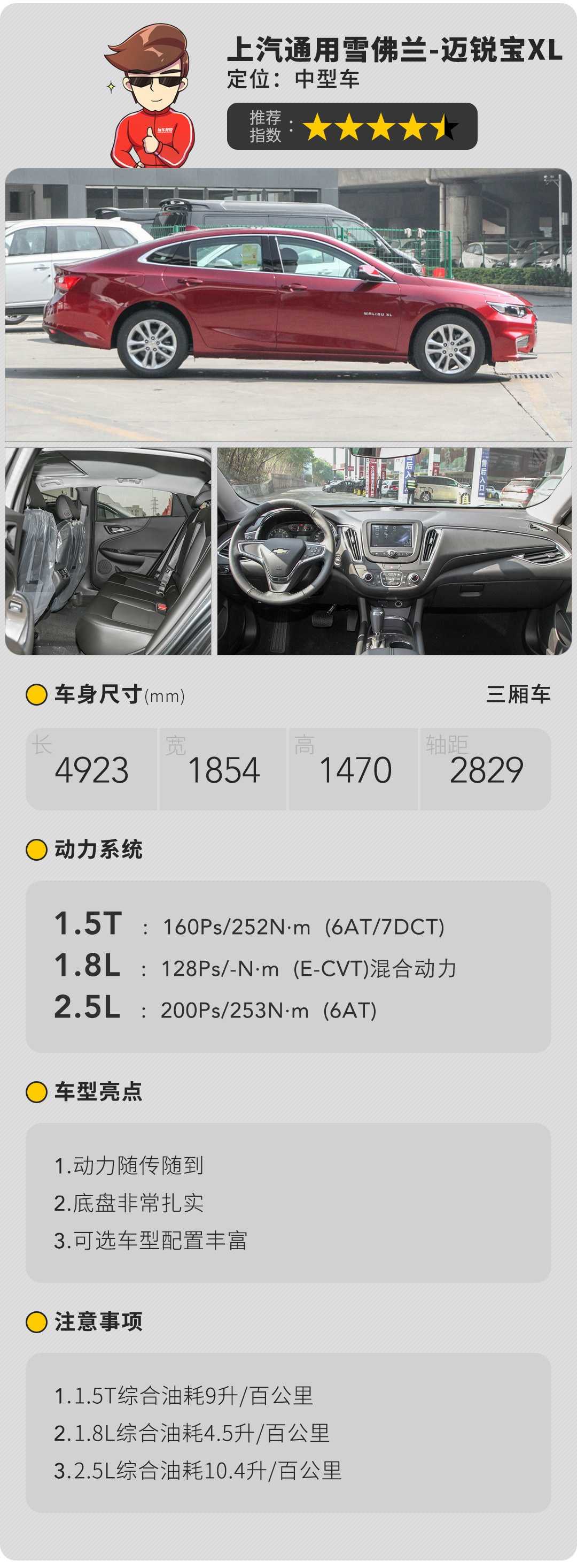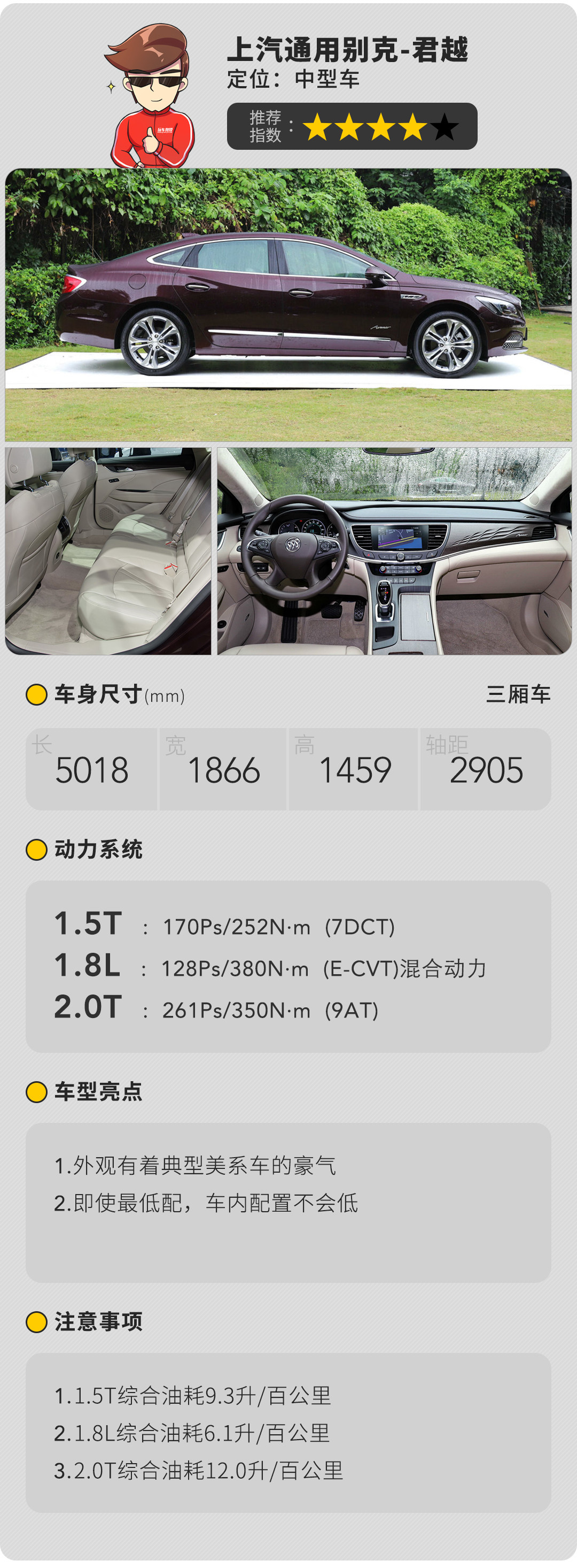 以上三款车型虽然都是叫中型车,但它们所对应的消费人群却大有不同,现代名图给家用需求高的消费者提供很好的车型;雪佛兰迈锐宝XL则是更多对应想为家里出一分力的年轻人;至于别克君越,家用不失大气商用不失面子,只要预算足够,它绝对是性价比最高的车型。