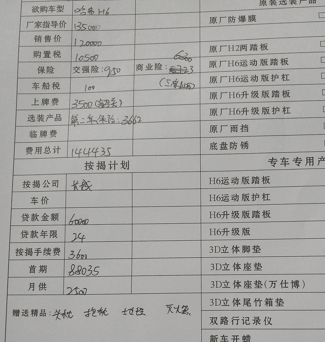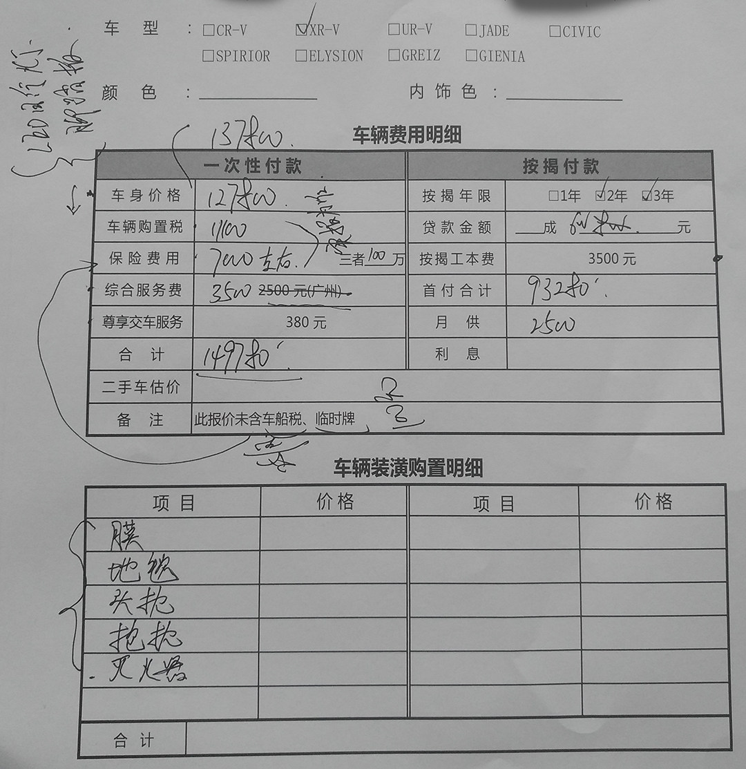 那么车型是怎么确定下来的呢,本田X-RV当然是选择1.5L的就够了,教授的朋友这是这么选的,而1.5L的自动挡只有一款经典版,自然就是它了。而哈弗H6以往是很多车型的,可能连哈弗销售自己都分不清。2018款的哈弗H6就少了很多,销售给过来的配置单只有蓝标的1.5T豪华型,超豪华型和2.0T的豪华型,对比了一下配置和价格,确定了1.5T的豪华型。