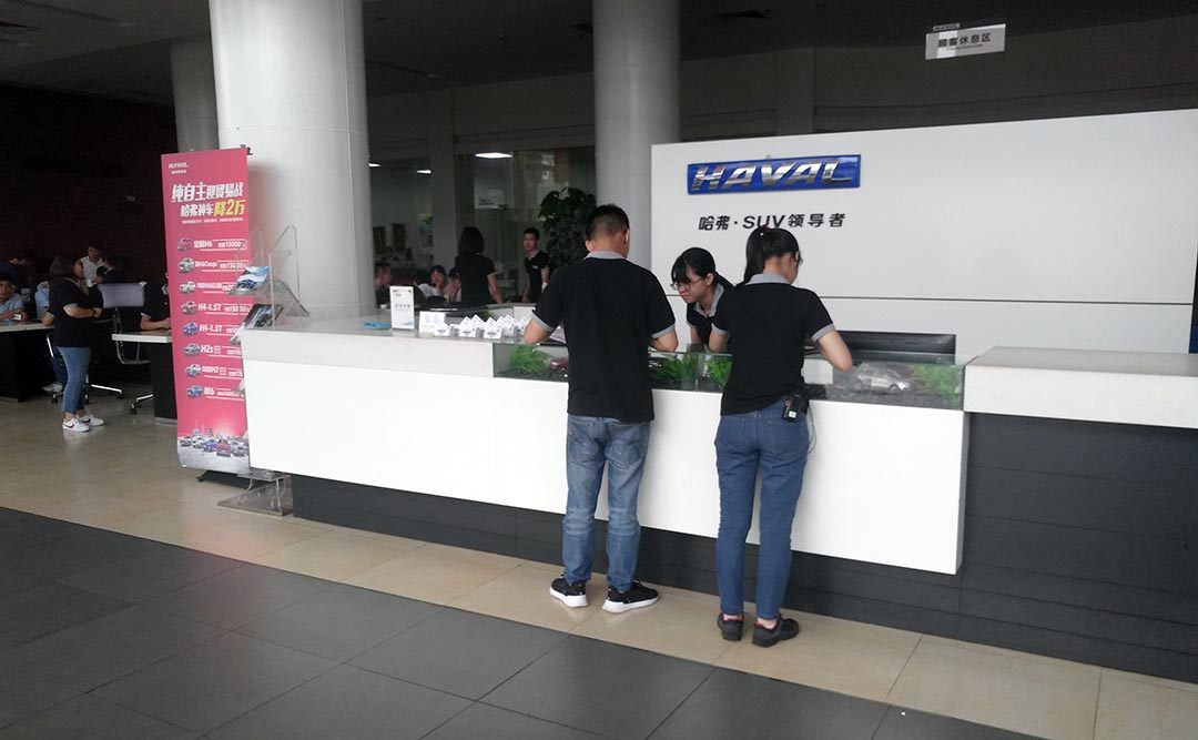 哈弗的店则会好很多,下午这个时候来看车的人非常多,店内的销售也是忙前忙后,不仅在门口有横幅,进到店内也有气球装饰,以及一些礼品,优惠活动,看上去节日氛围更加浓重。