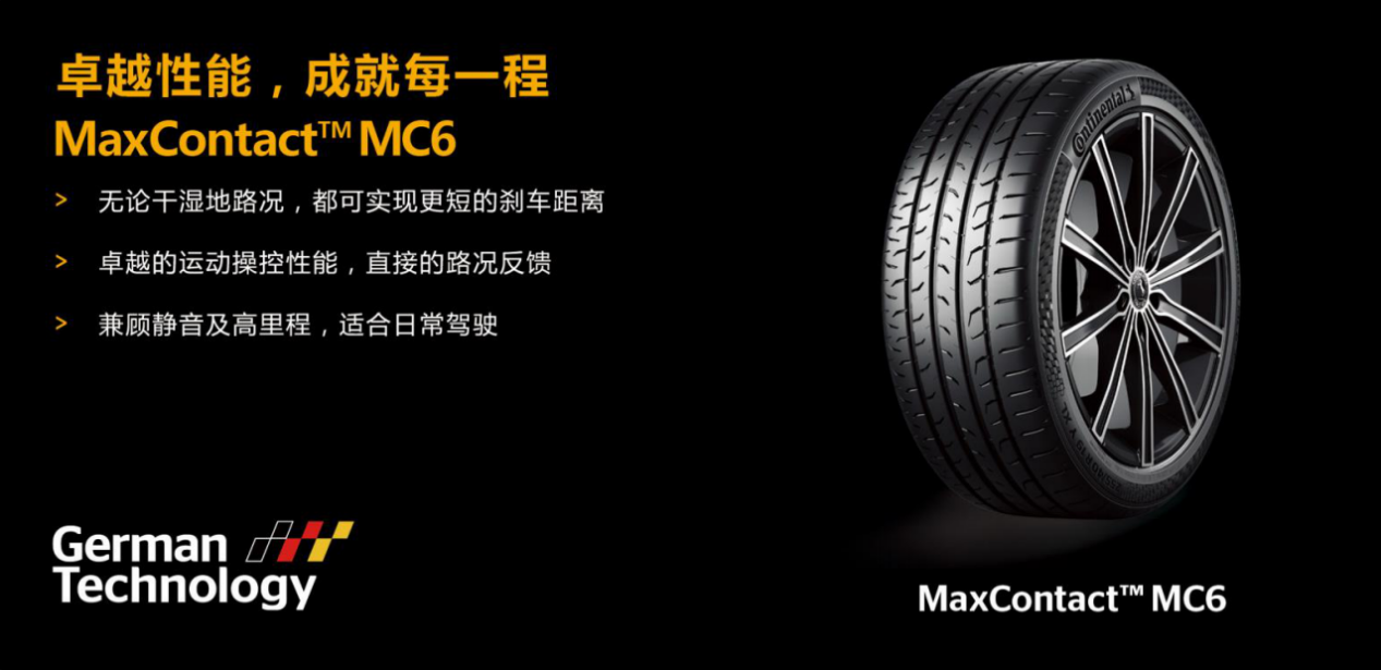 轮胎的话推荐马牌MC6™,MC6™采用了专为抓地设计的花纹,以及沟槽稳定键的应用,无论是在干湿地路况,都可实现出色的运动操控性能,同时提高转向稳定性,不仅可以为十来万的家用车提升操控,还能给上百万的跑车发挥性能,基本能胜任所有城市路况。