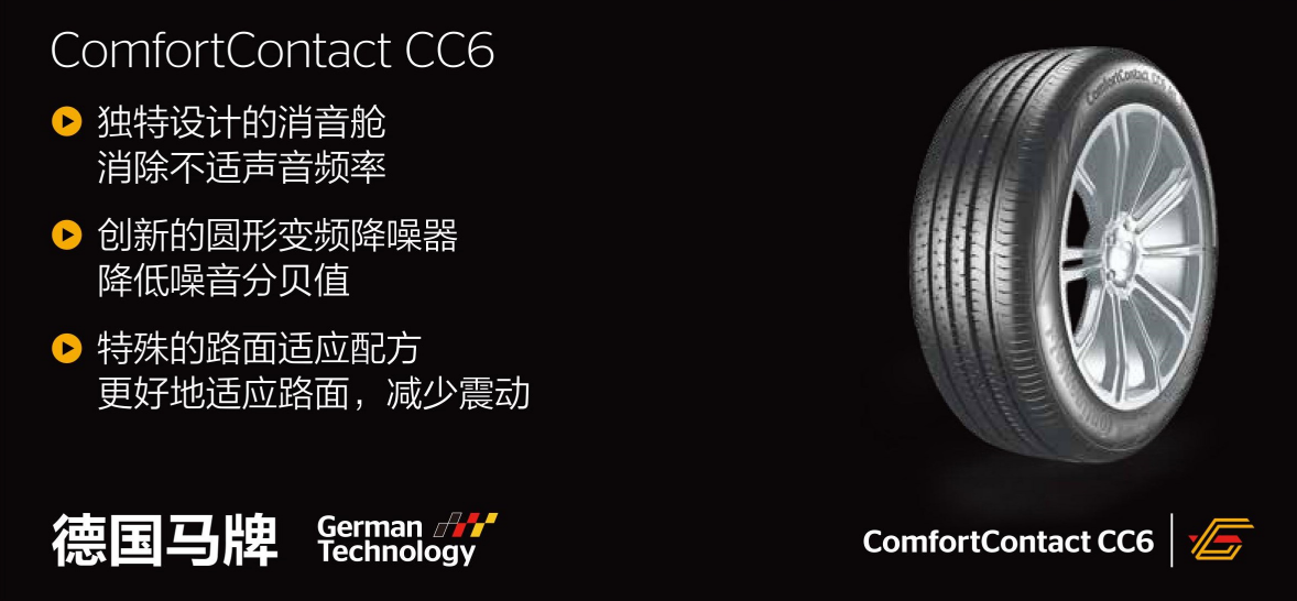 减少胎噪的话,马牌的CC6非常有效。CC6特有的消音舱利用“亥姆霍兹共振器”的原理,可以消除令人不适的噪音,优化驾乘体验;独有的圆形变频降噪器可以打破噪音声波,从而降低噪音水平,实现更佳的静音效果,获得更舒适的驾乘体验。