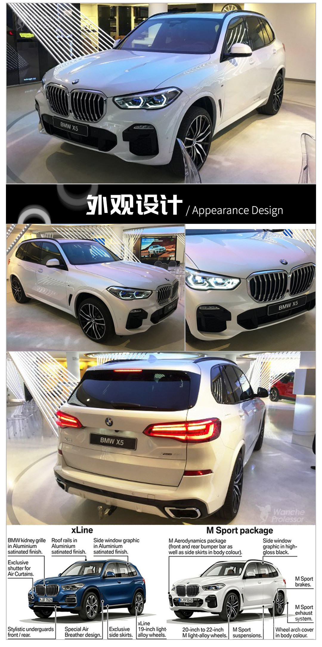 全新一代X5官方提供了两种个性化套装,分别是xLine跟M Sport套装,两种套装在外饰与内饰都有着不同的区别,最直观的是两个套装分别有不同的前保险杠设计,可以看到M Sport套装的保险杠有着更大的进气格栅,加上与车身同色的侧裙,整车视觉重心更低,更运动。在不显眼的地方诸如排气以及刹车系统都有相应的升级。除了外观的不同,内饰存在着差异,跑车化三幅式方向盘以及M版本踏板是M Sport套装的升级部分之一。