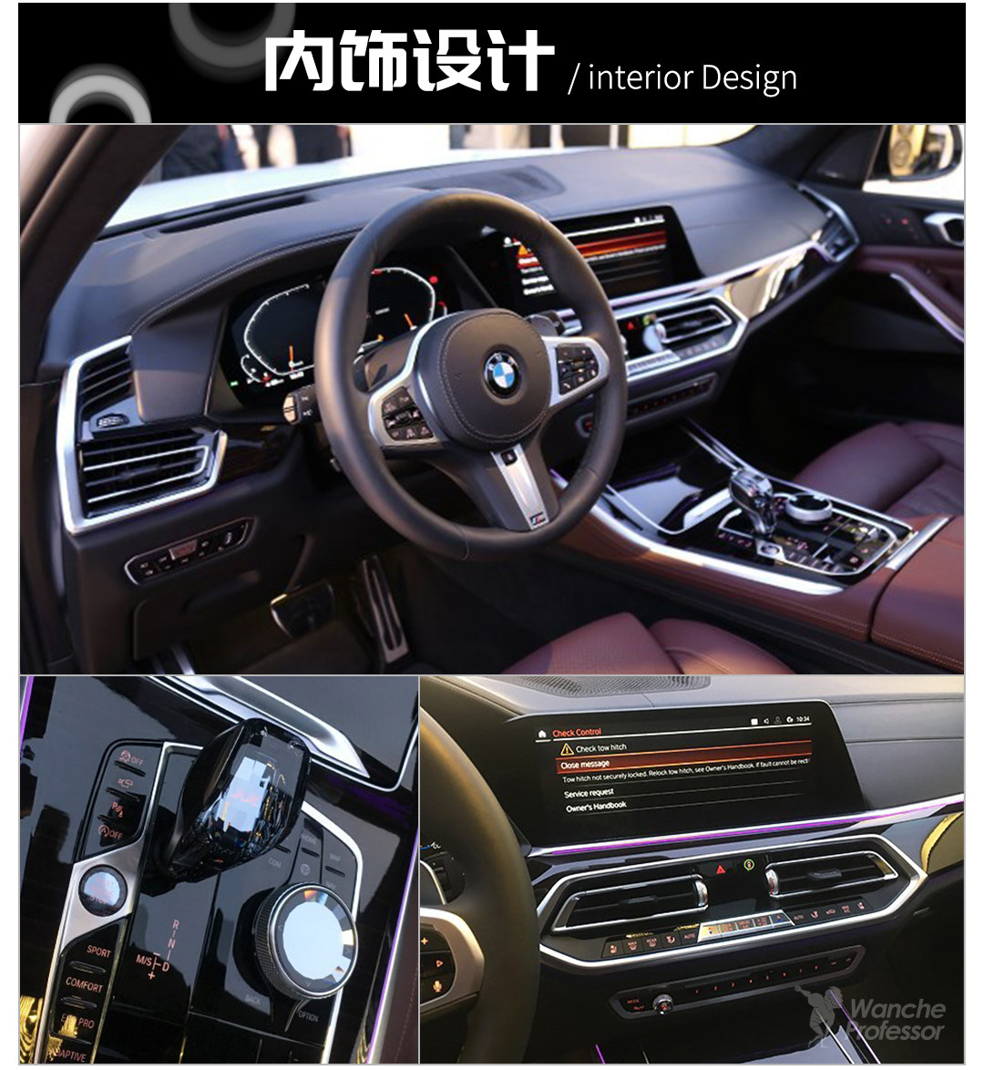 新一代X5的内饰布局给人熟悉的感觉,仔细看就会发现,许多全新的设计元素被融入了这套熟悉的内饰:六边形的设计元素、全新的液晶仪表界面、向驾驶员方向倾斜的中控台、全新的档把造型等。对比老款车型,整套内饰看上去更加豪华、档次感更高。同时,新车使用了全新iDrive7.0系统,控制旋钮与排挡部分经过重新设计,一键启动按钮由方向盘右侧移动到了挡把的左边,让启动、挂挡的动作一气呵成。