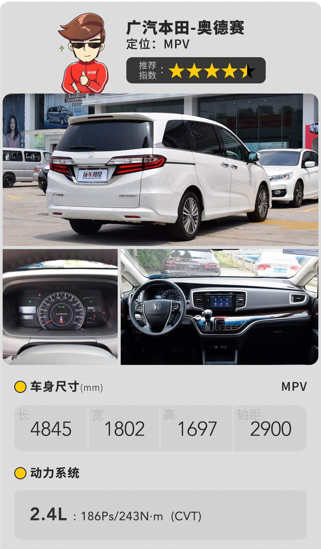 奥德赛只有一款2.4L的自然吸气发动机,账面数据虽然不出色,不过日常使用的时候动力完全足够,最重要的是油耗比GL8和GM8的2.0T要低不少。而且奥德赛2900mm的轴距保证了乘坐空间宽敞舒适,不会比GL8之类的商用MPV小太多,实用性有保障。