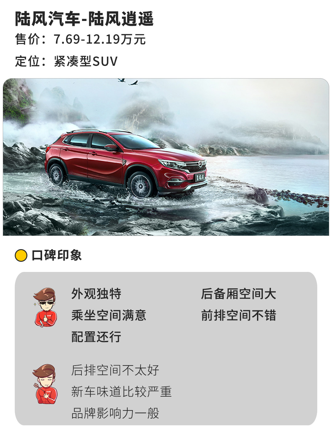 陆风逍遥在今年1月正式上市,6月那会有新增车型的加入,同时还进行了降价。看来逍遥是一款铁了心要走量的紧凑型SUV车型。外观原创度高、配置有亮点、售价也不高的逍遥其实还是挺有噱头的。如果要推荐一款车型,2018款 1.5GTDI 手动全景黄金版算是比较下得去手一款,这是手动挡的顶配车型,整体配置水平还算够用,而且售价不高于10万,有一定的吸引力。