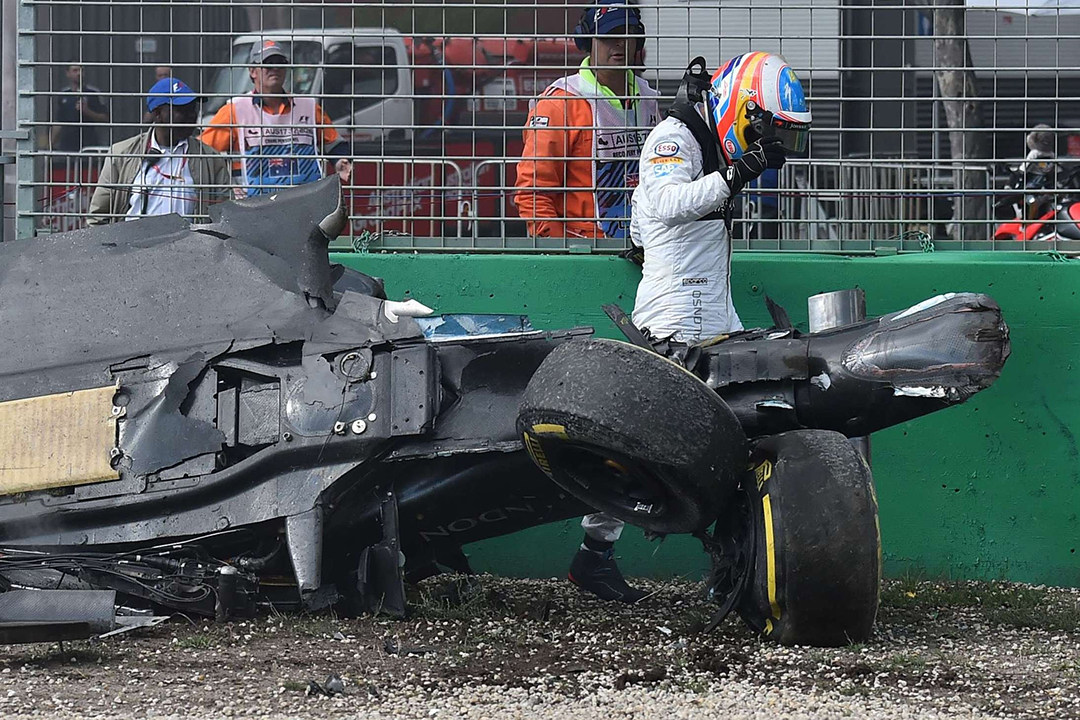车看上去是撞得面目全非,但是溃缩吸能设计和强大的碳纤维单体壳让阿隆索得以在经历这场严重事故后毫发无损地离开赛车。