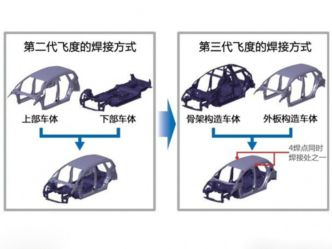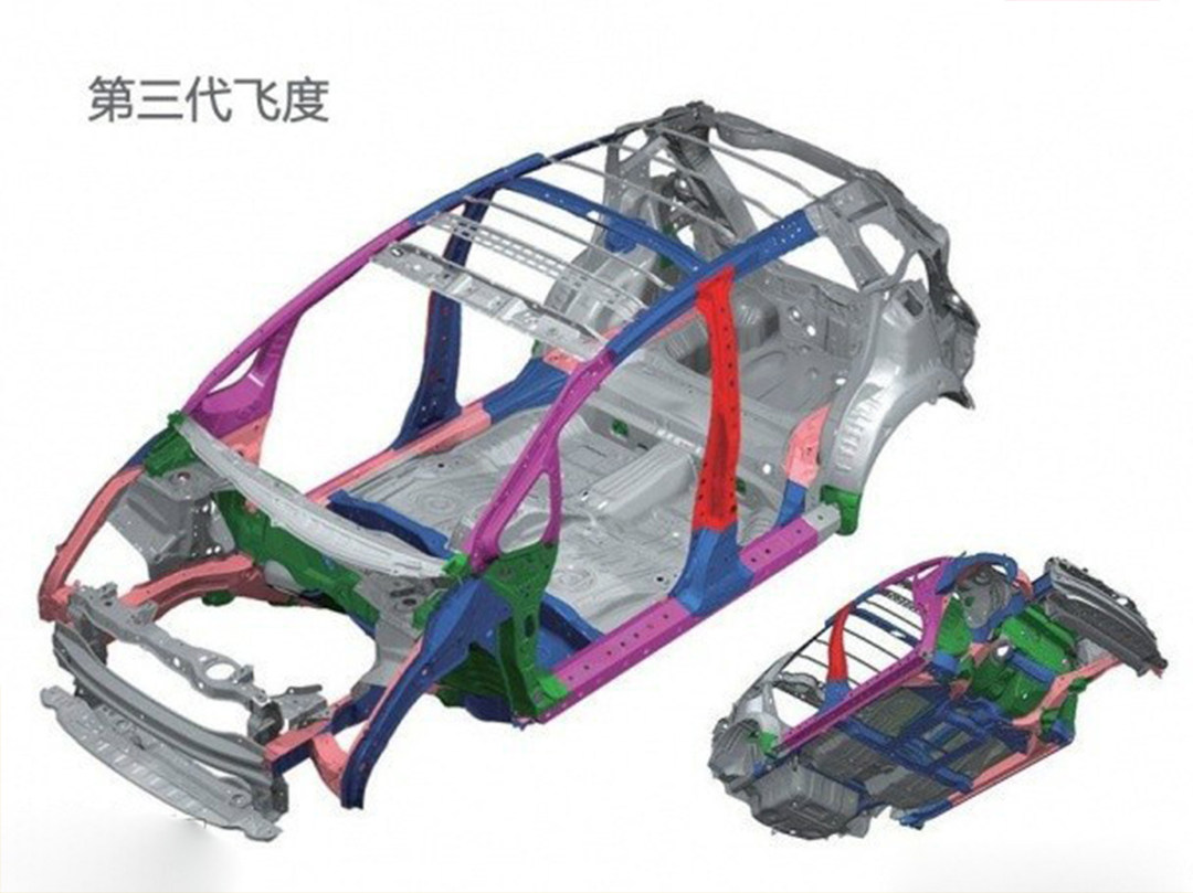 而JDM(日本市场)的第三代飞度所使用的钢材强度规格就远不如USDM(美国市场)了,但是JDM(日本市场)的第三代飞度采用了了新的内骨架+外车皮的拼装工艺,使其在同样安全的标准情况下获得更轻的车身。